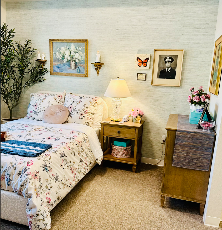 Relocated elderly client into assisted living. To personalize, we gave her all new furniture and grass cloth wall treatment along with client's own art and accessories.